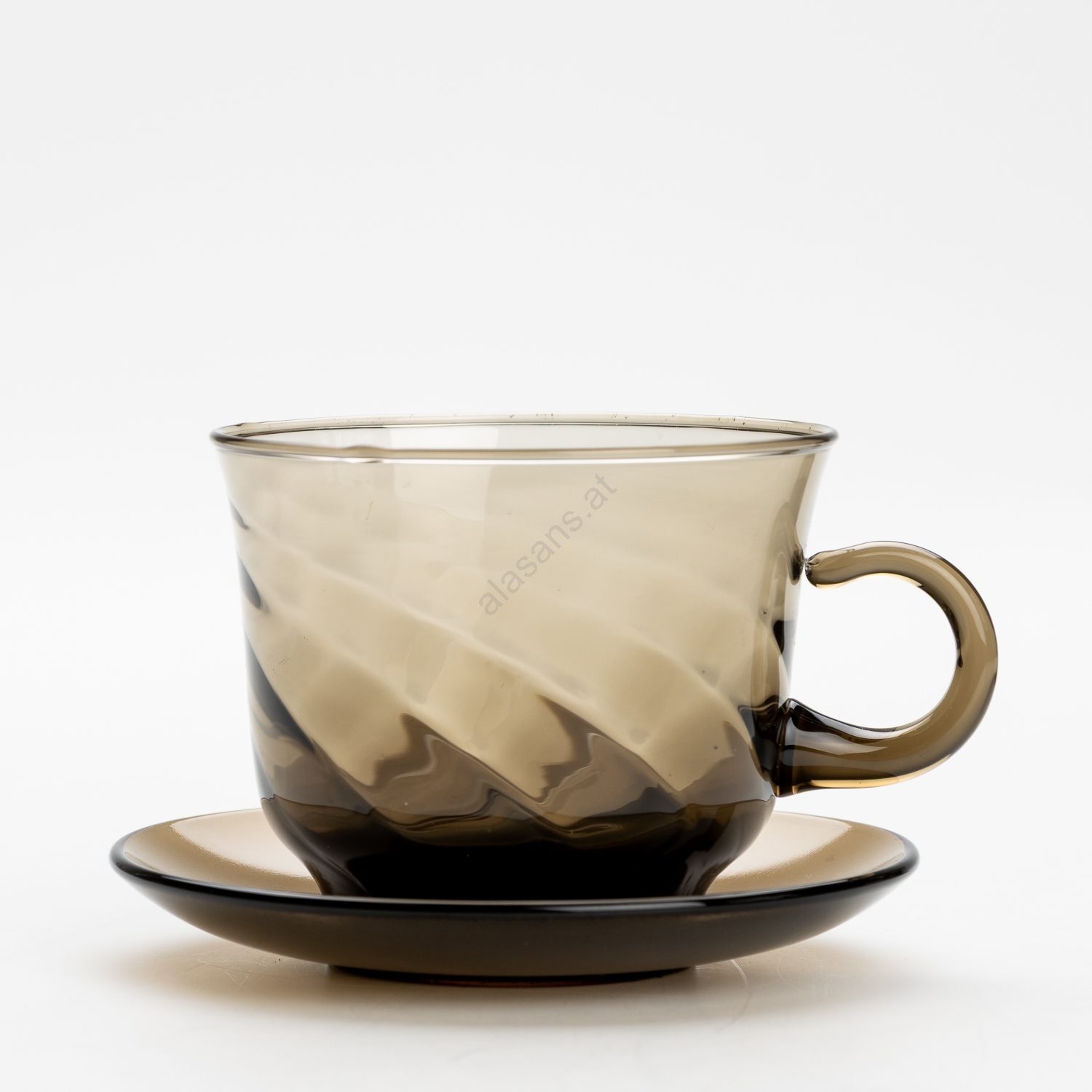 Set aus 6 Glastassen mit Untertassen und 1 Rauchglas-Zuckerdose