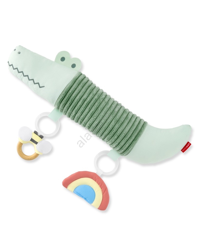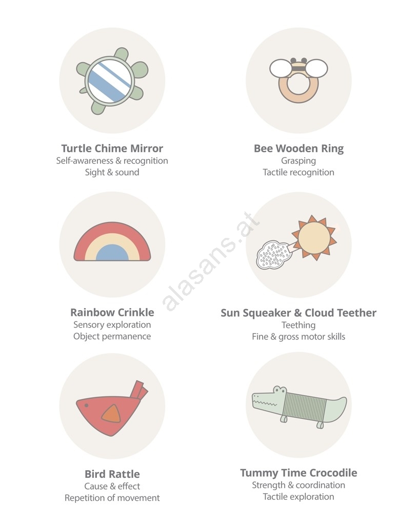 • Enthält 5 hängende Spielzeuge, z. B. eine Schildkröte mit Spiegel, eine Quietschsonne mit Beißring oder einen raschelnden Regenbogen.