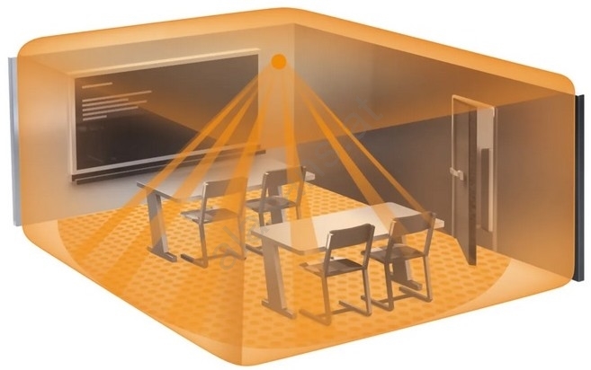 • DualTech COM1Ultraschall-Präsenzmelder in weißer Farbe, geeignet für die Deckenmontage.