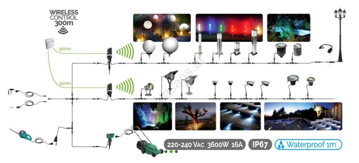 • Integrieren Sie das Steuergerät in das Gartenbeleuchtungsschema und schalten Sie die Beleuchtung aus der Ferne ein.