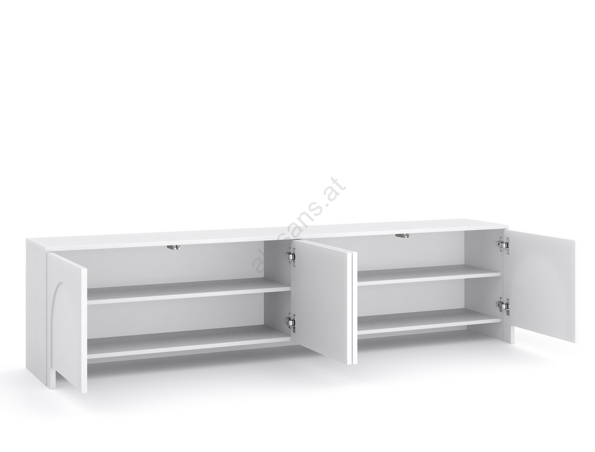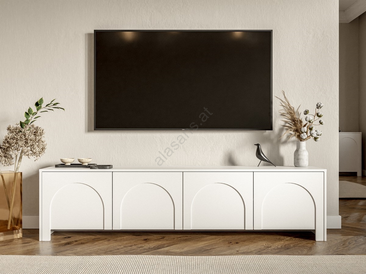 • Dank seiner langen, rechteckigen Form eignet es sich ideal als Unterschrank unter einem an der Wand montierten Fernseher oder als moderne Aufbewahrungslösung im Wohnzimmer.