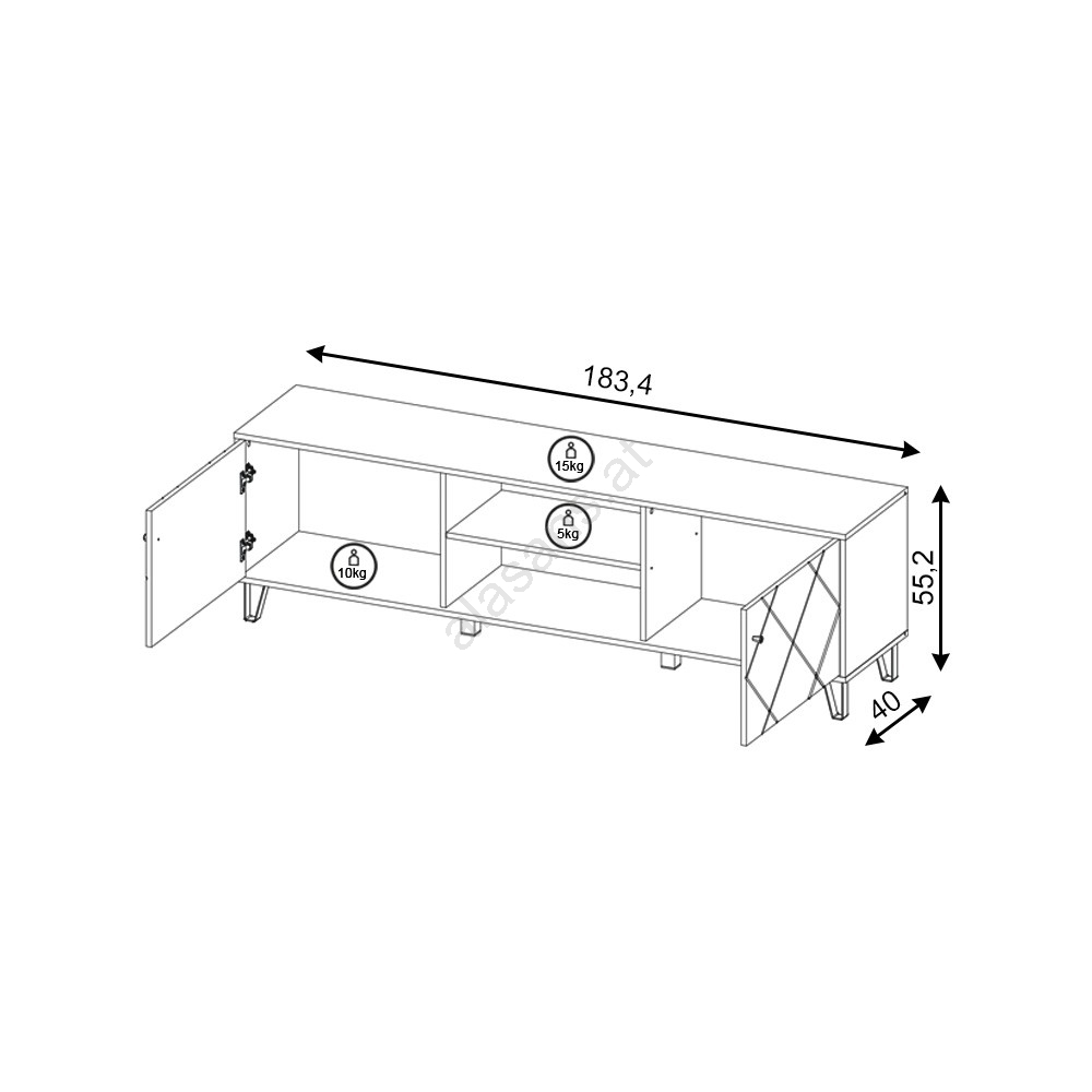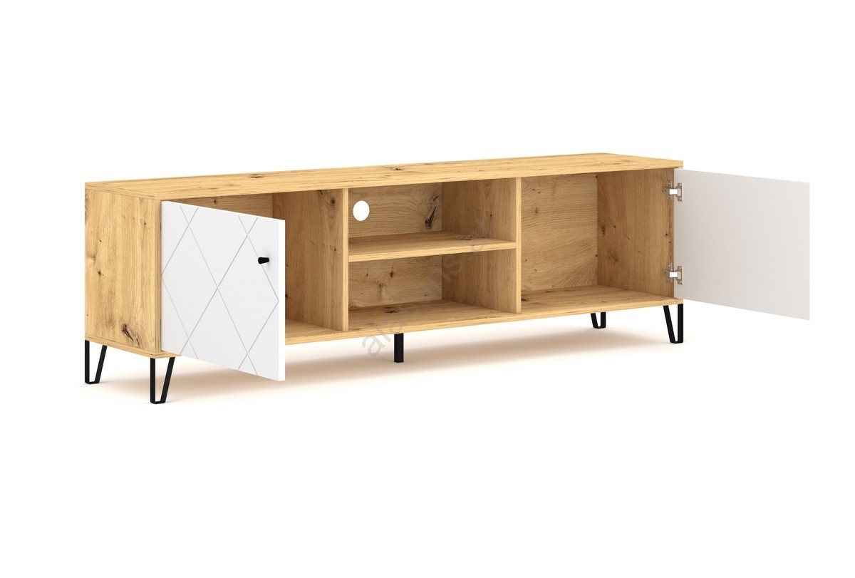 • Es verfügt über zwei geschlossene seitliche Fächer, jeweils mit Türen und dekorativer diagonal verlaufender Verzierung, sowie zwei offene Ablagen mit Kabeldurchlass in der Mitte.