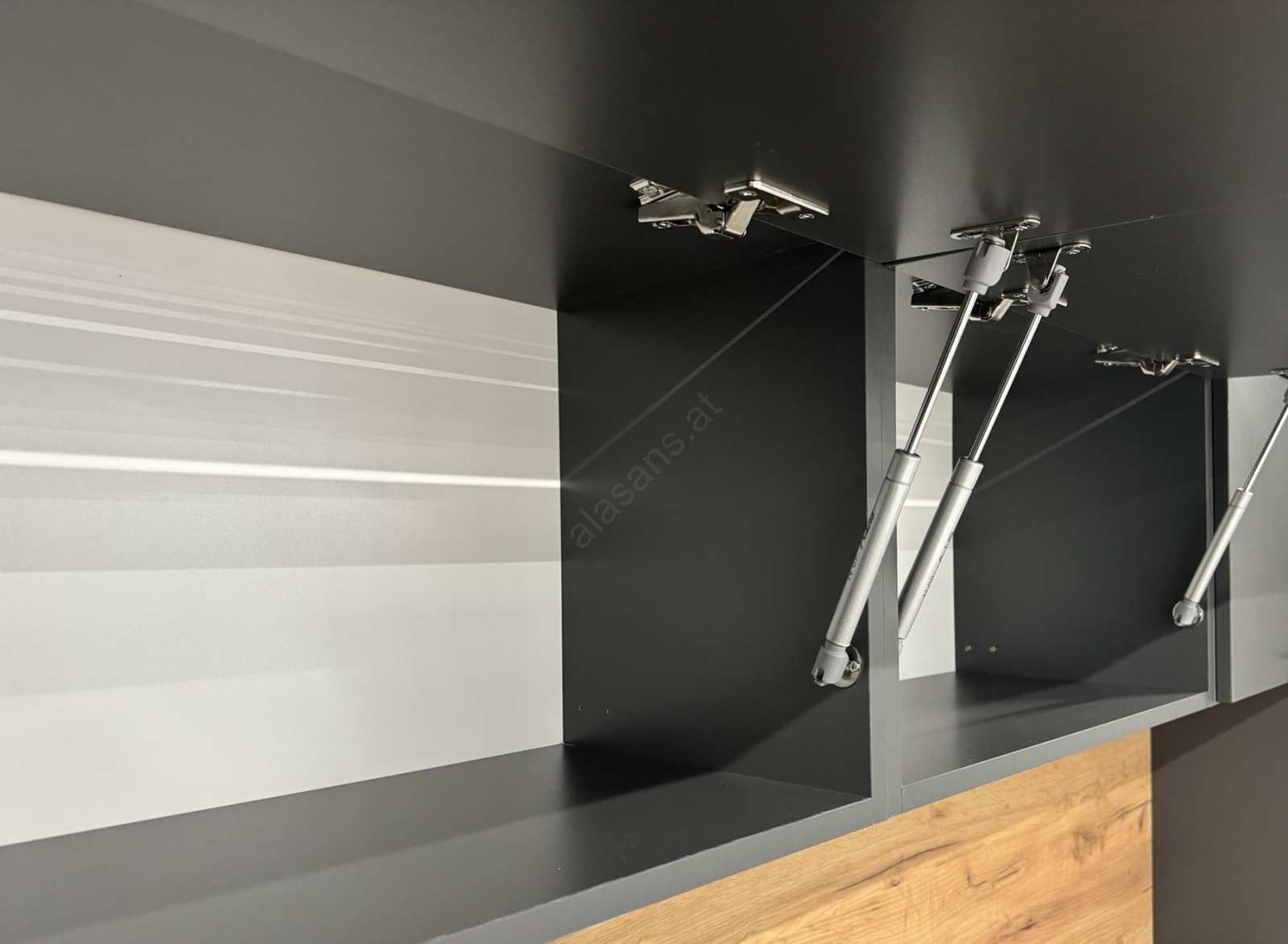 • Oberschränke sind mit Gasdruckfedern ausgestattet, in den Schubladen sind hochwertige eingekapselte Metall führungen.
