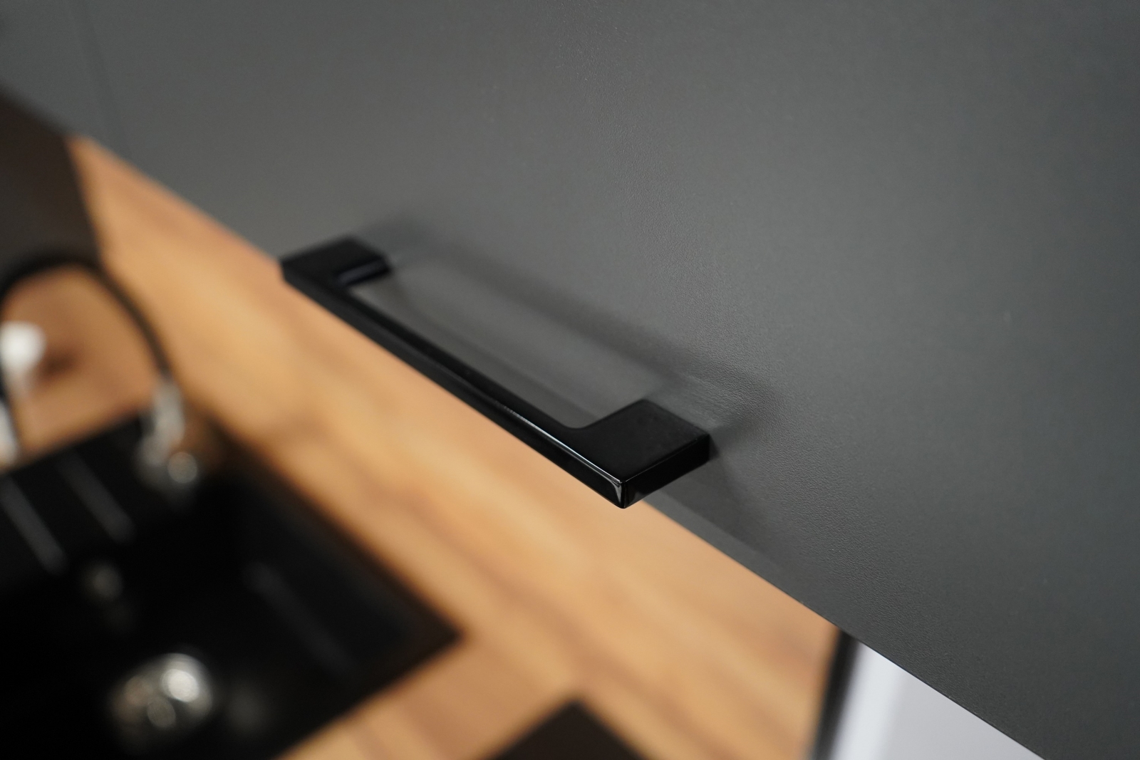 • Die Fronten der Oberschränke und des Unterschranks sind matt ausgeführt.