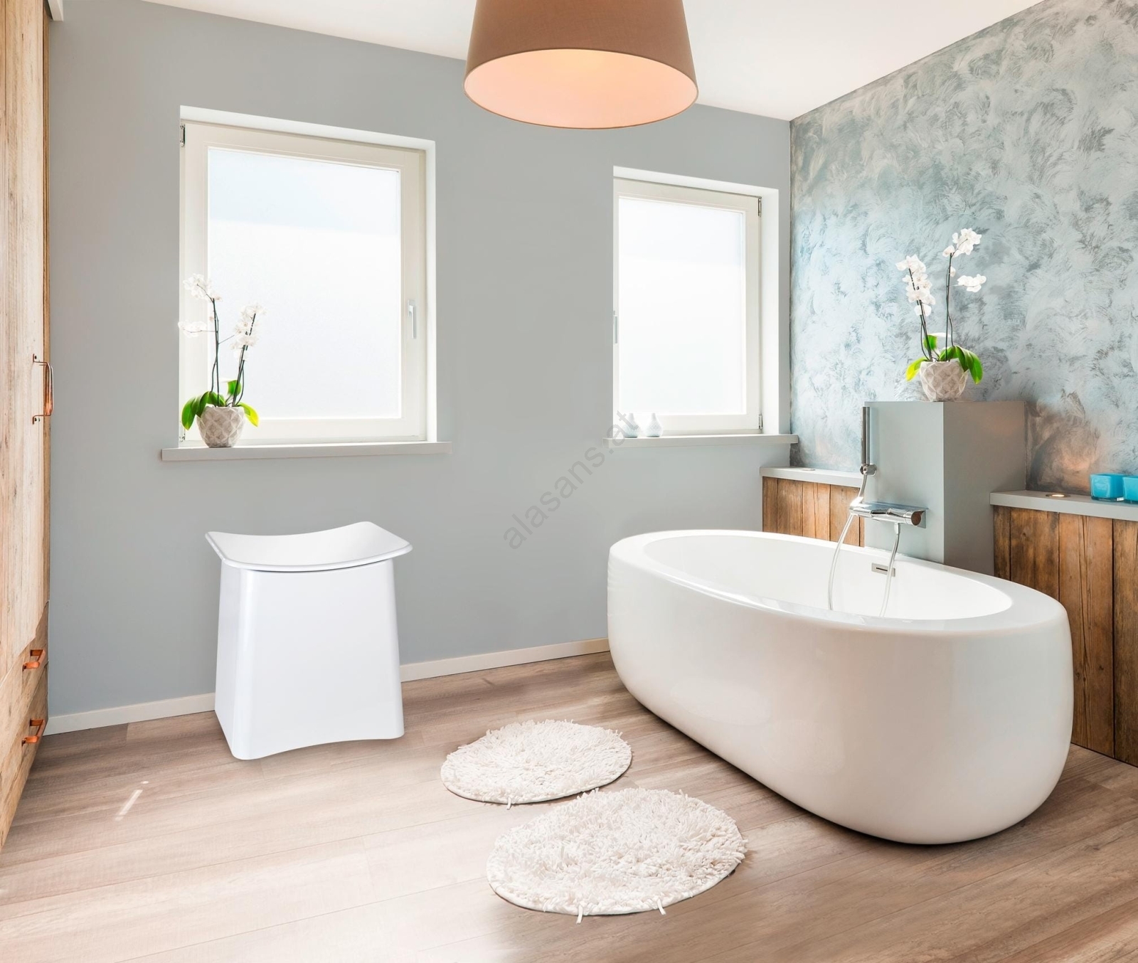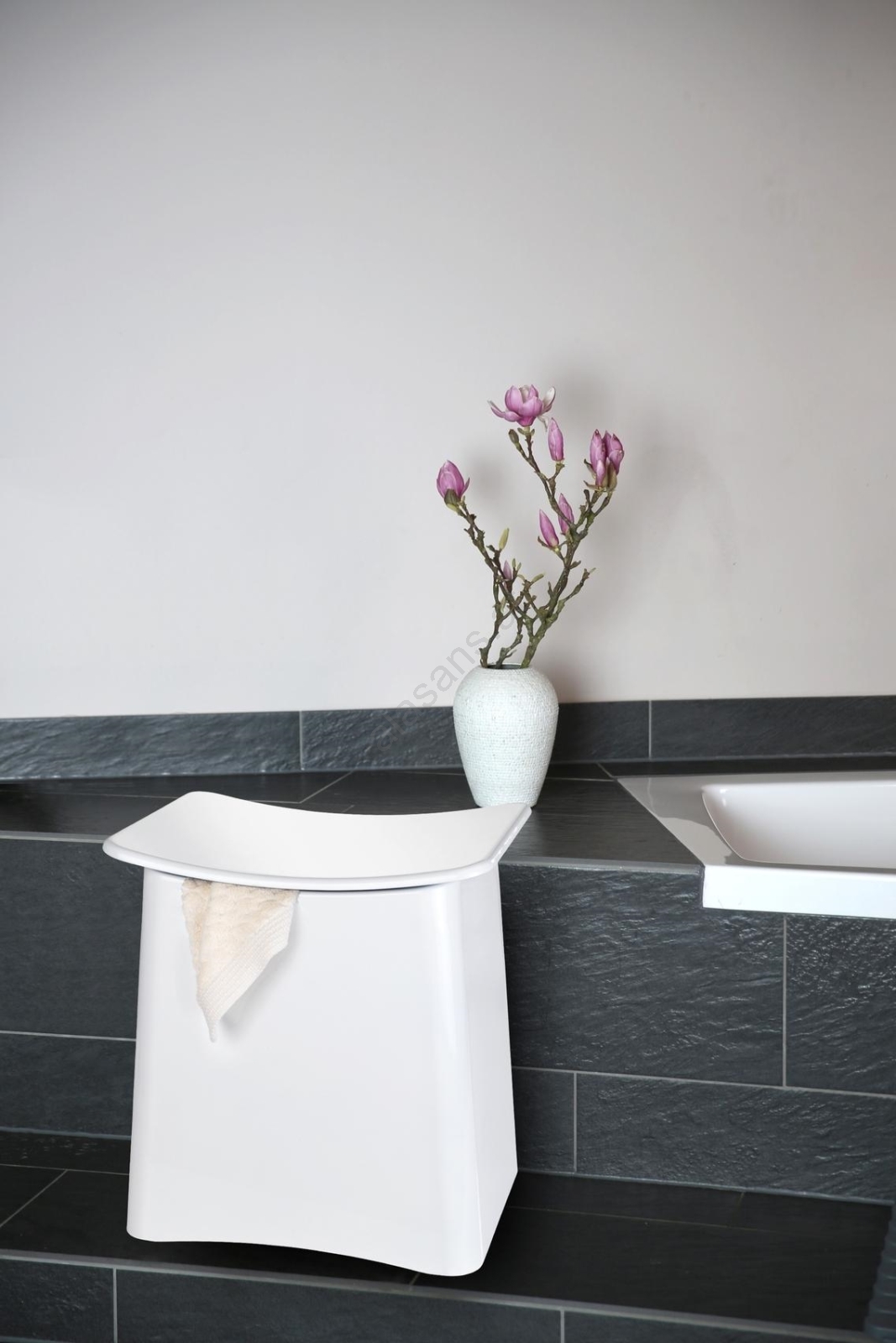 • Stylischer Badezimmerhocker mit geschwungenem, modernem Design.