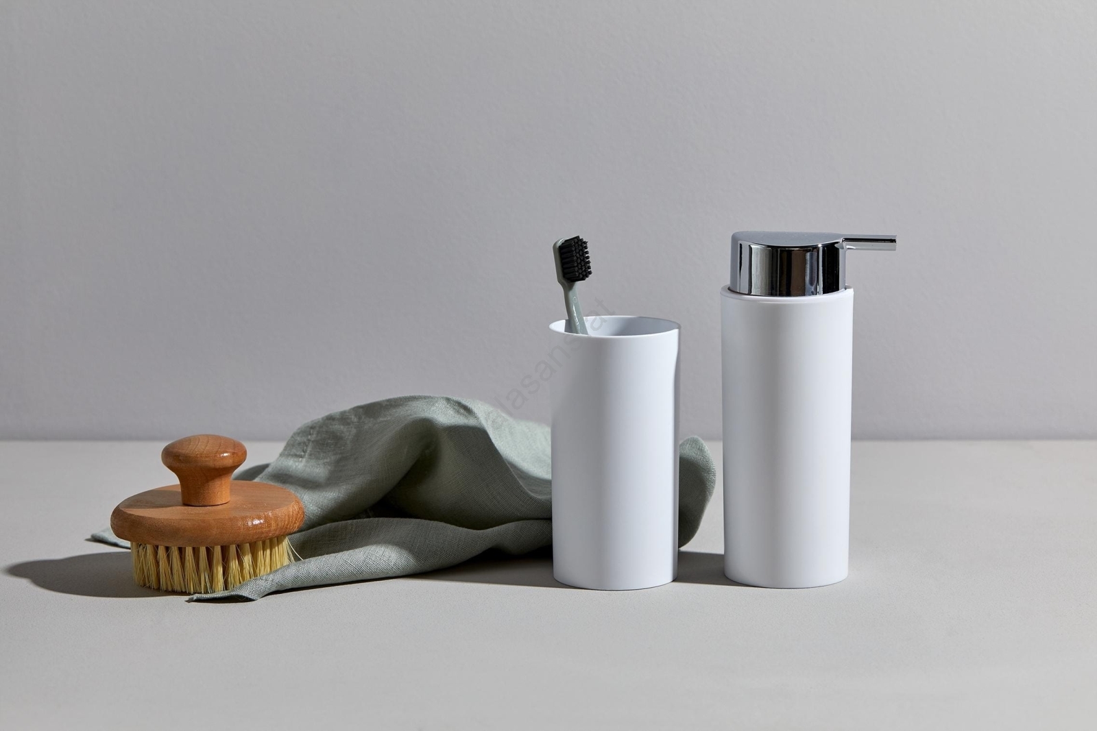 • Enthält Seifenspender, Zahnputzbecher, WC-Bürste mit Halter und Kosmetikeimer.