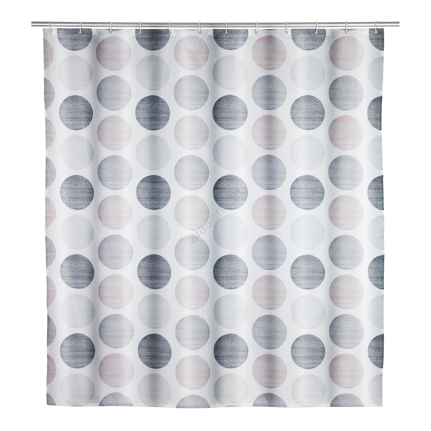 • Moderner Duschvorhang mit zartem Pastell-Punktmuster in Grau- und Rosétönen.