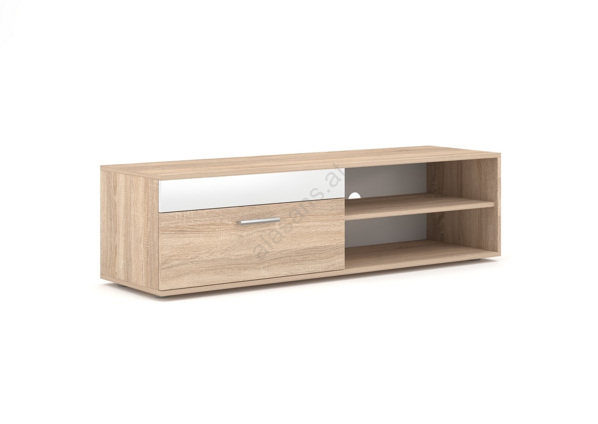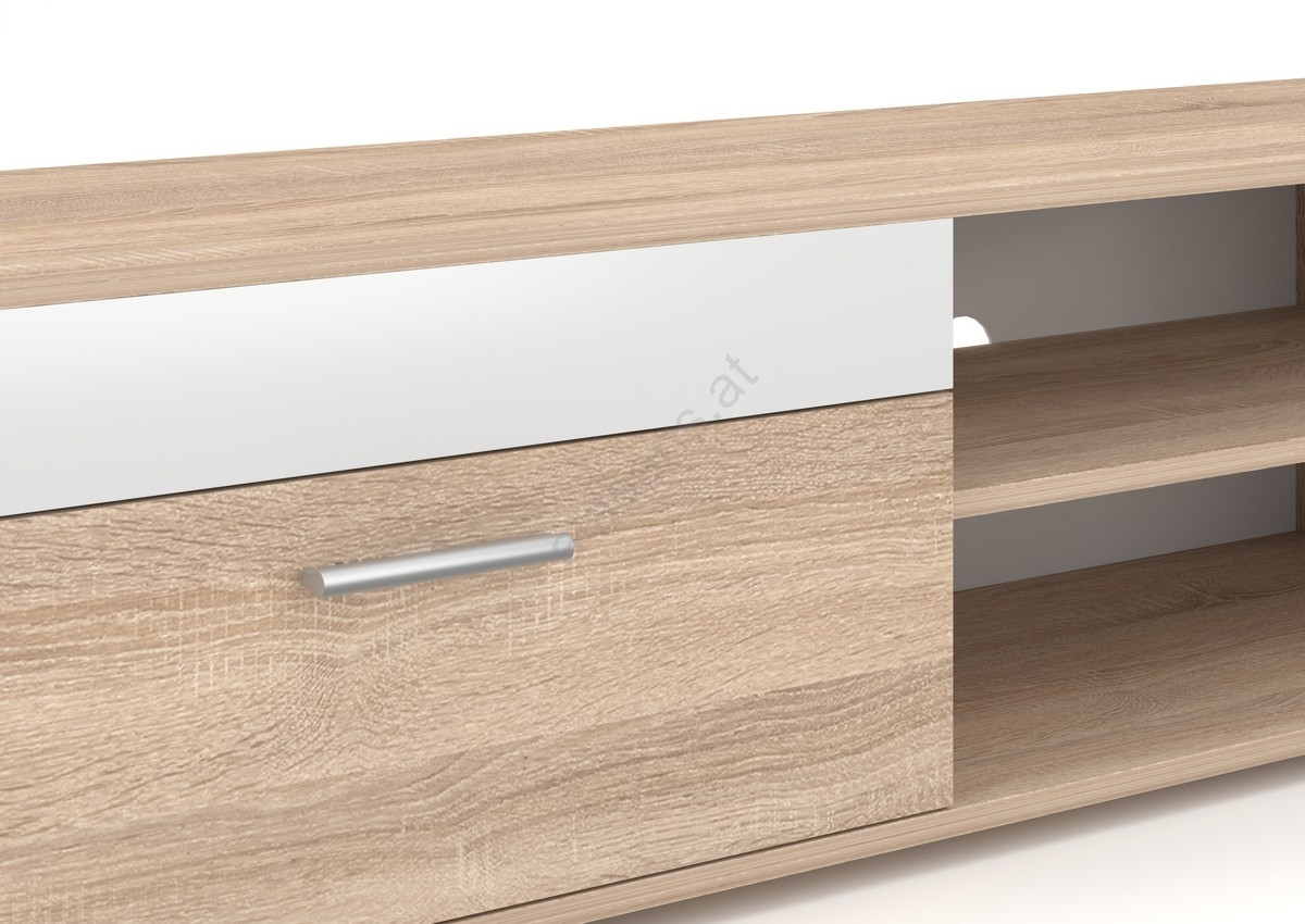 • Zum Set gehört ein geräumiges TV-Lowboard mit offenen Regalfächern für Mediengeräte und geschlossenen Fächern für diskrete Aufbewahrung.