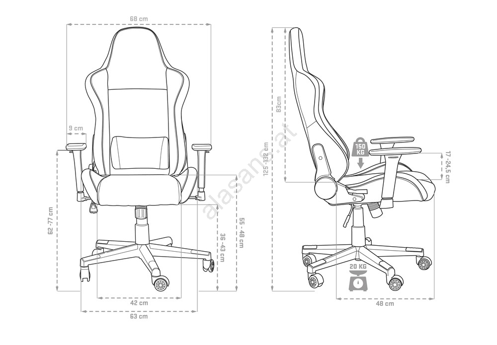 • Das komplette Untergestell mit Stahlrahmen, Rädern und Gashebevorrichtung der Sicherheitsklasse 4 ist für eine maximale Belastung von 150 kg ausgelegt.